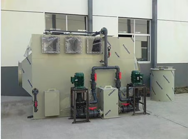 化学洗涤塔是一种内部装有填料喷射型的洗涤器,广泛应用于工业废气净化、除尘等方面的前处理,净化效果很好。吸收液通过水泵和塔体外部水管进入塔内,由喷嘴形成的雾滴与废气充分接触,然后液滴喷洒至填料表面,与废