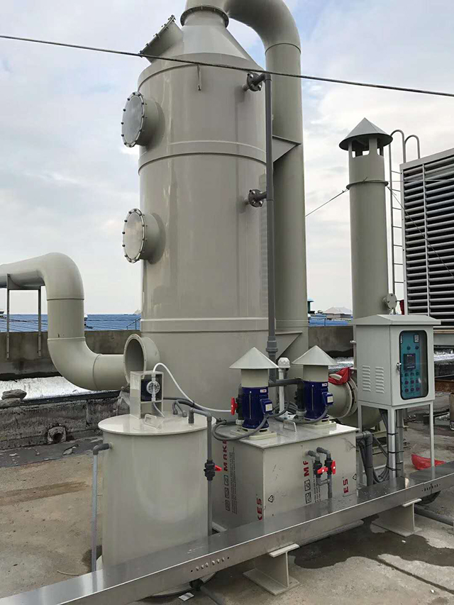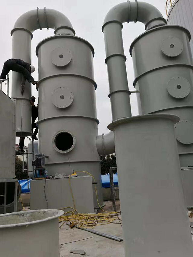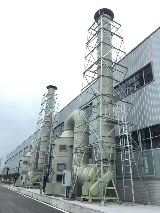化学洗涤塔是一种内部装有填料喷射型的洗涤器,广泛应用于工业废气净化、除尘等方面的前处理,净化效果很好。吸收液通过水泵和塔体外部水管进入塔内,由喷嘴形成的雾滴与废气充分接触,然后液滴喷洒至填料表面,与废气进行充分的接触反应,最后吸收液汇合到塔体底部水箱,通过水泵不断循环。废气从化学洗涤塔的底部侧面进入,经过处理后从塔体顶部排出。气流与吸收液在塔内作相对运动,并在填料表面形成很大表面积的水膜,从而大大提高了吸收作用。