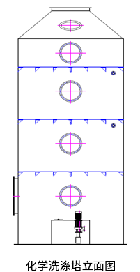 化学洗涤塔是一种内部装有填料喷射型的洗涤器,广泛应用于工业废气净化、除尘等方面的前处理,净化效果很好。吸收液通过水泵和塔体外部水管进入塔内,由喷嘴形成的雾滴与废气充分接触,然后液滴喷洒至填料表面,与废气进行充分的接触反应,最后吸收液汇合到塔体底部水箱,通过水泵不断循环。废气从化学洗涤塔的底部侧面进入,经过处理后从塔体顶部排出。气流与吸收液在塔内作相对运动,并在填料表面形成很大表面积的水膜,从而大大提高了吸收作用。
